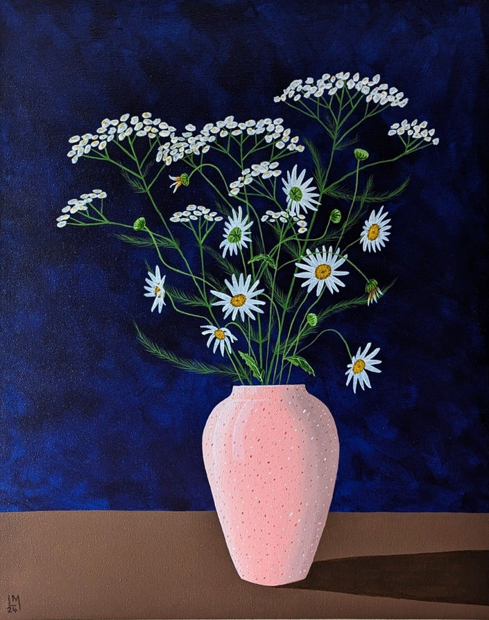 My creative process begins with growing flowers, fruits and vegetables on the allotment. I am with the work for every part of its journey: planting seeds, tending to saplings, stretching and priming canvases, harvesting and arranging produce, painting, and finally preserving the bounty through jam-making, fermenting and freezing.